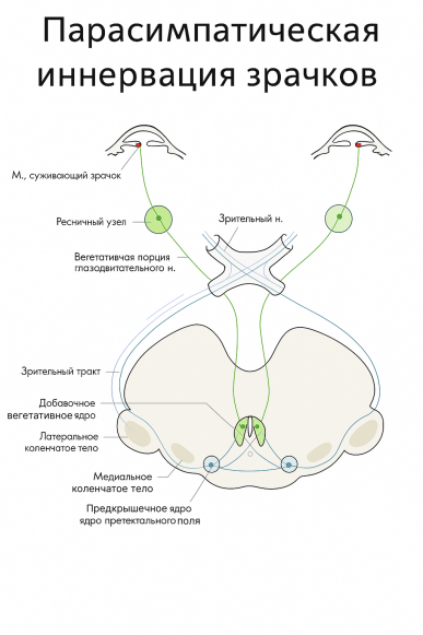 Афферентные импульсы идут из сетчатки в зрительную кору, затем в притектальное поле, оттуда — к парасимпатическому ядру Перле, далее — в ресничный узел, и, наконец, к сфинктеру зрачка. Волокна, идущие к ресничной мышце и к сфинктеру зрачка, топографически разобщены и могут поражаться изолированно, например, при синдроме Аргайла—Робертсона.